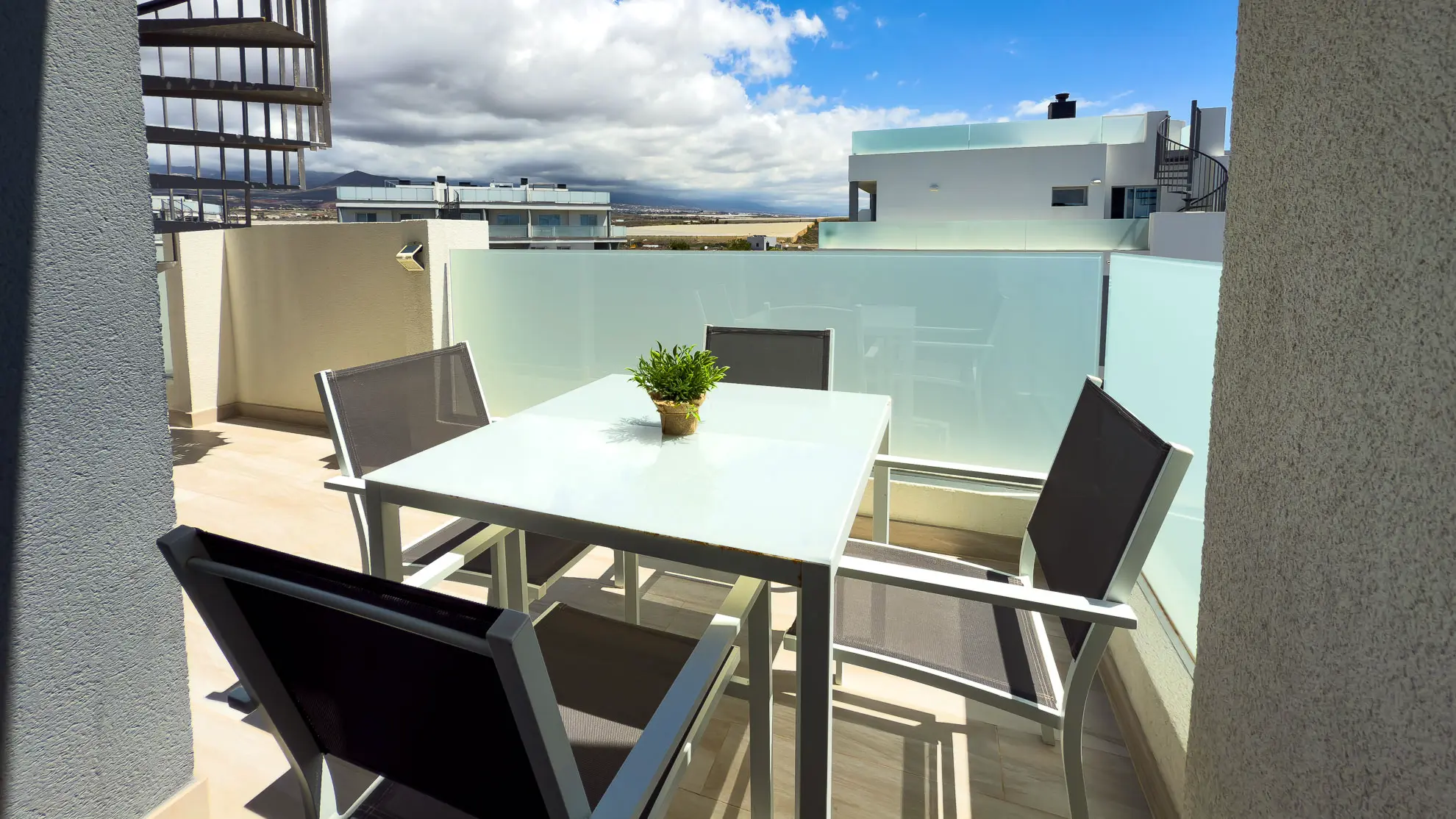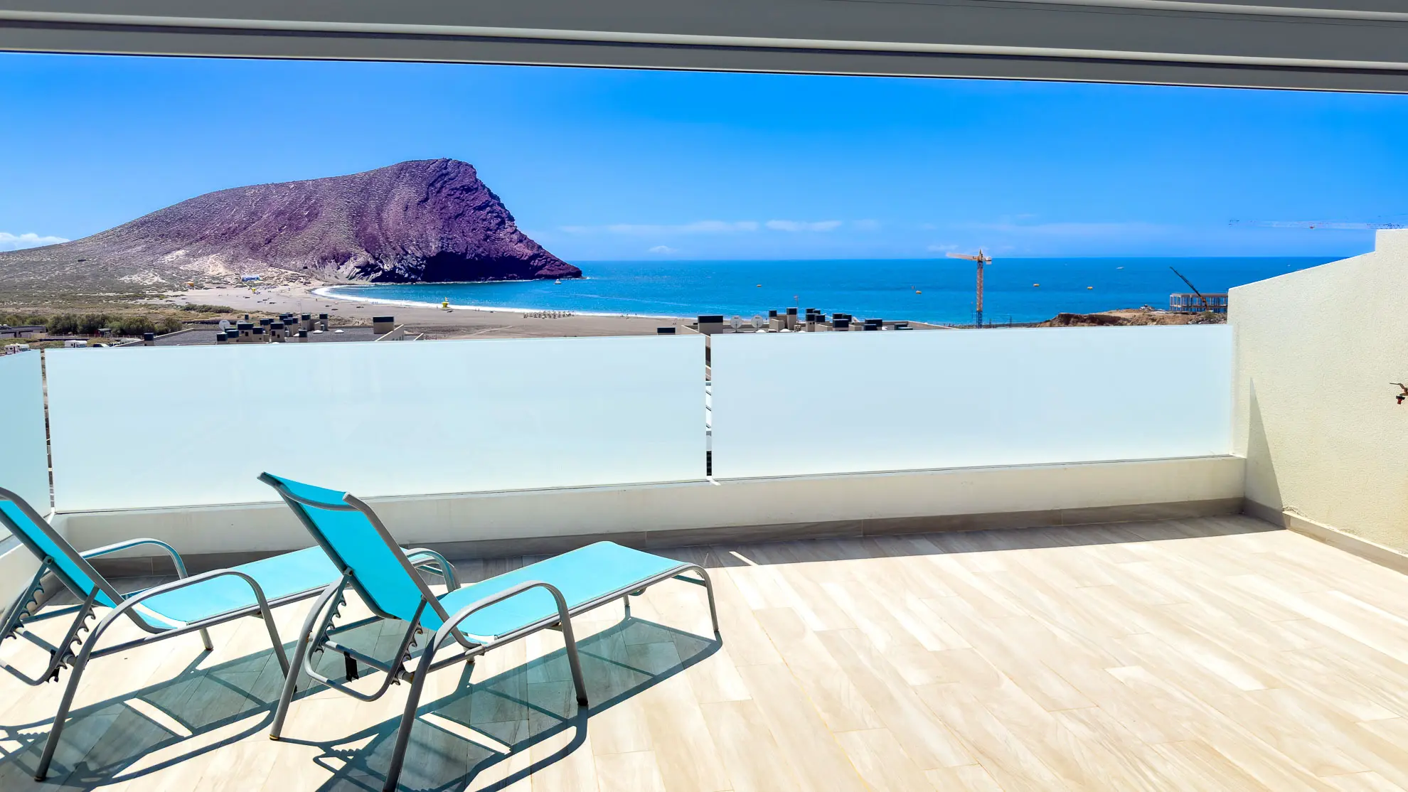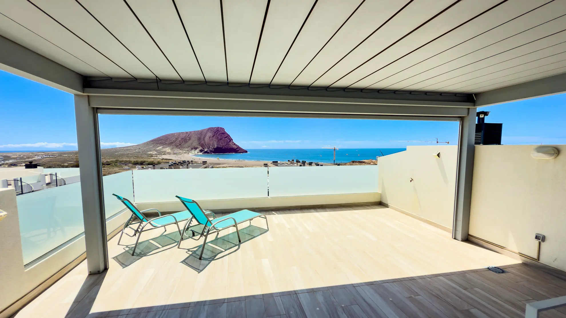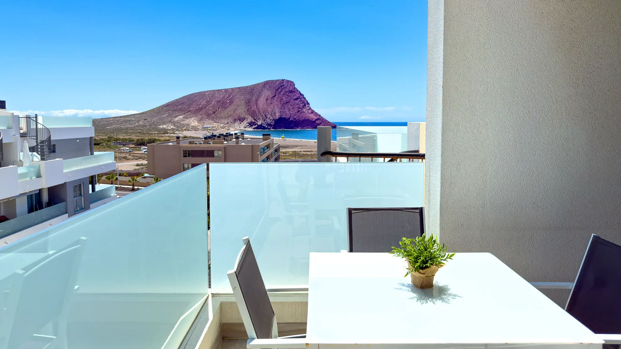 To, co dělá tento apartmán jedinečným, jsou jeho dvě soukromé terasy, které nabízejí neopakovatelné zážitky. První z nich, snadno dostupná z obývacího pokoje, je vybavena jídelním stolem se čtyřmi židlemi, což ji činí ideálním místem pro venkovní snídaně a večeře při západu slunce. Skutečným klenotem je však druhá terasa, o patro výše. Tato střešní terasa nabízí panoramatické výhledy na rozlehlou pláž Playa La Tejita, impozantní sopečný kužel Montaña Roja a v dálce se tyčící ikonickou horu El Teide. Je to perfektní místo pro odpočinek na pohodlné venkovní sedací soupravě nebo pro opalování na lehátkách, daleko od shonu a davů.