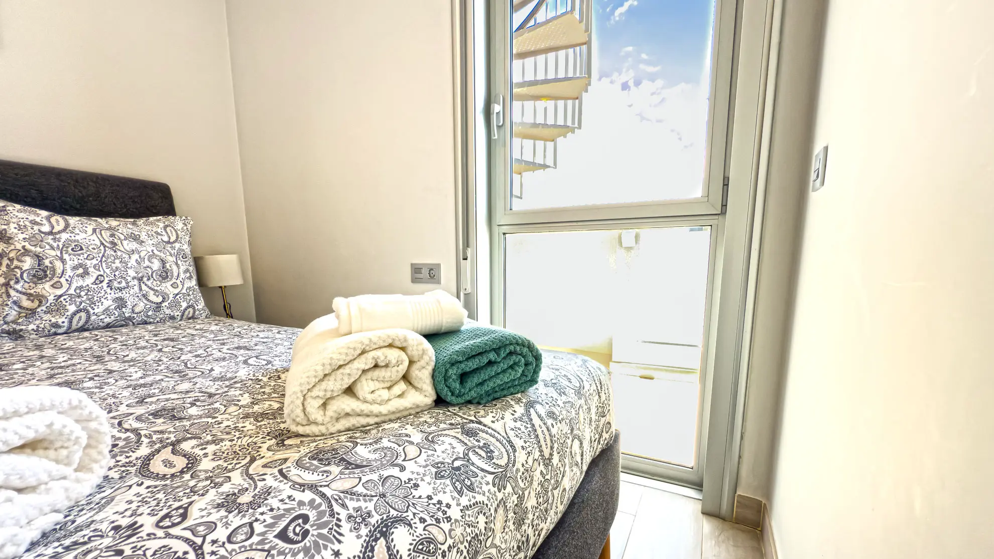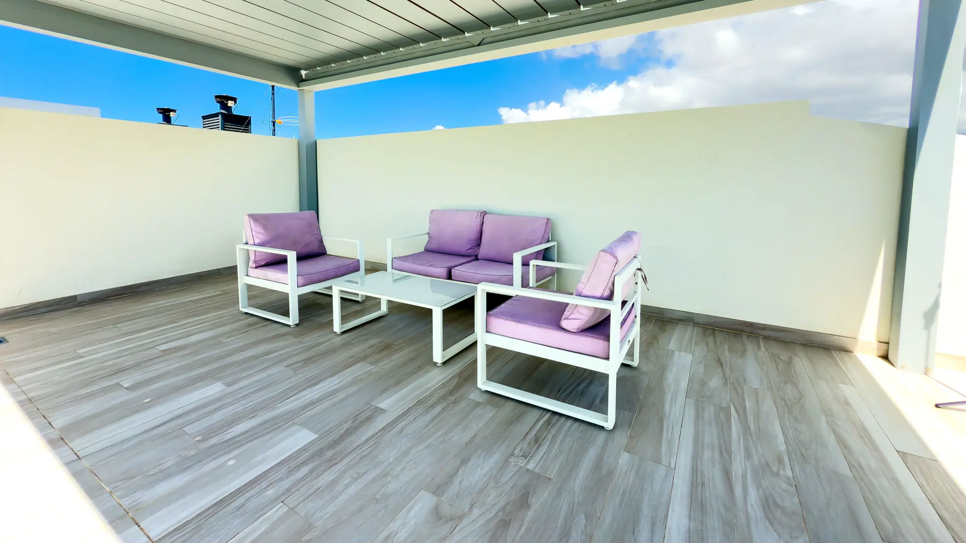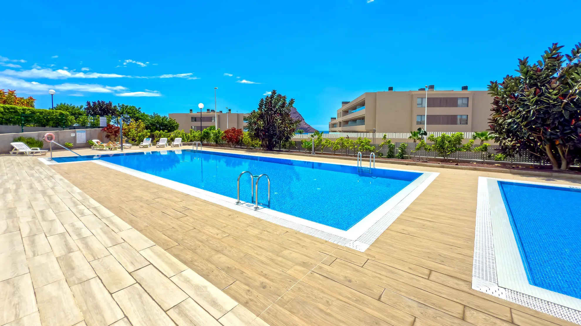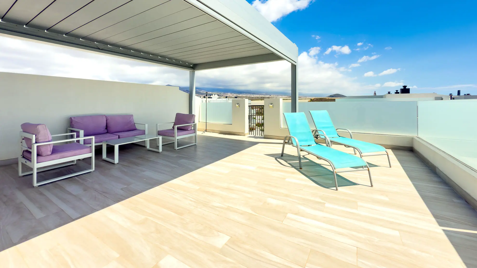 To, co dělá tento apartmán jedinečným, jsou jeho dvě soukromé terasy, které nabízejí neopakovatelné zážitky. První z nich, snadno dostupná z obývacího pokoje, je vybavena jídelním stolem se čtyřmi židlemi, což ji činí ideálním místem pro venkovní snídaně a večeře při západu slunce. Skutečným klenotem je však druhá terasa, o patro výše. Tato střešní terasa nabízí panoramatické výhledy na rozlehlou pláž Playa La Tejita, impozantní sopečný kužel Montaña Roja a v dálce se tyčící ikonickou horu El Teide. Je to perfektní místo pro odpočinek na pohodlné venkovní sedací soupravě nebo pro opalování na lehátkách, daleko od shonu a davů.
