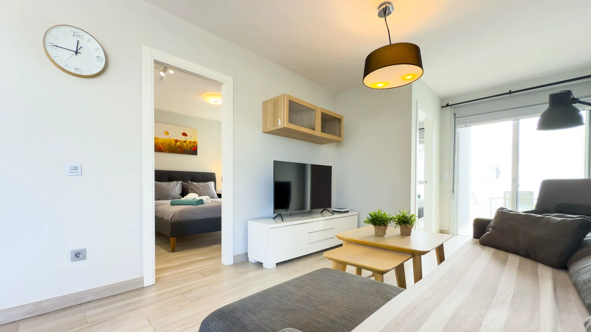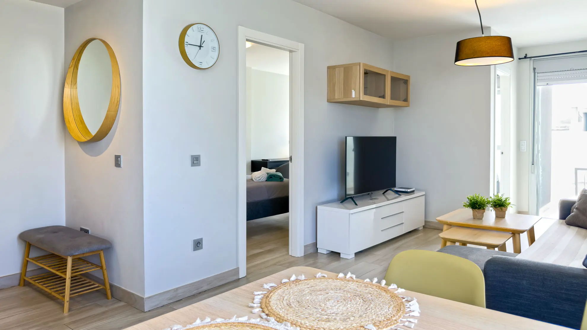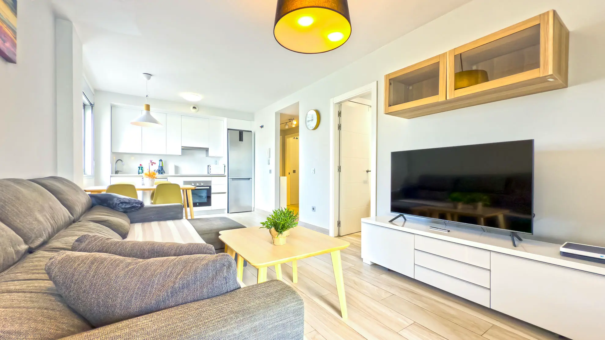 Apartmán je navržen s ohledem na maximální pohodlí a praktičnost. Obě ložnice jsou vybaveny komfortními manželskými postelemi a nabízejí dostatek úložného prostoru. Hlavní ložnice navíc disponuje psacím stolem, což ocení každý, kdo potřebuje pracovat i během dovolené. Prostorný obývací pokoj s velkou chytrou televizí a rozkládací sedačkou tvoří centrum apartmánu, je elegantně propojen s plně vybavenou kuchyní a jídelním koutem.