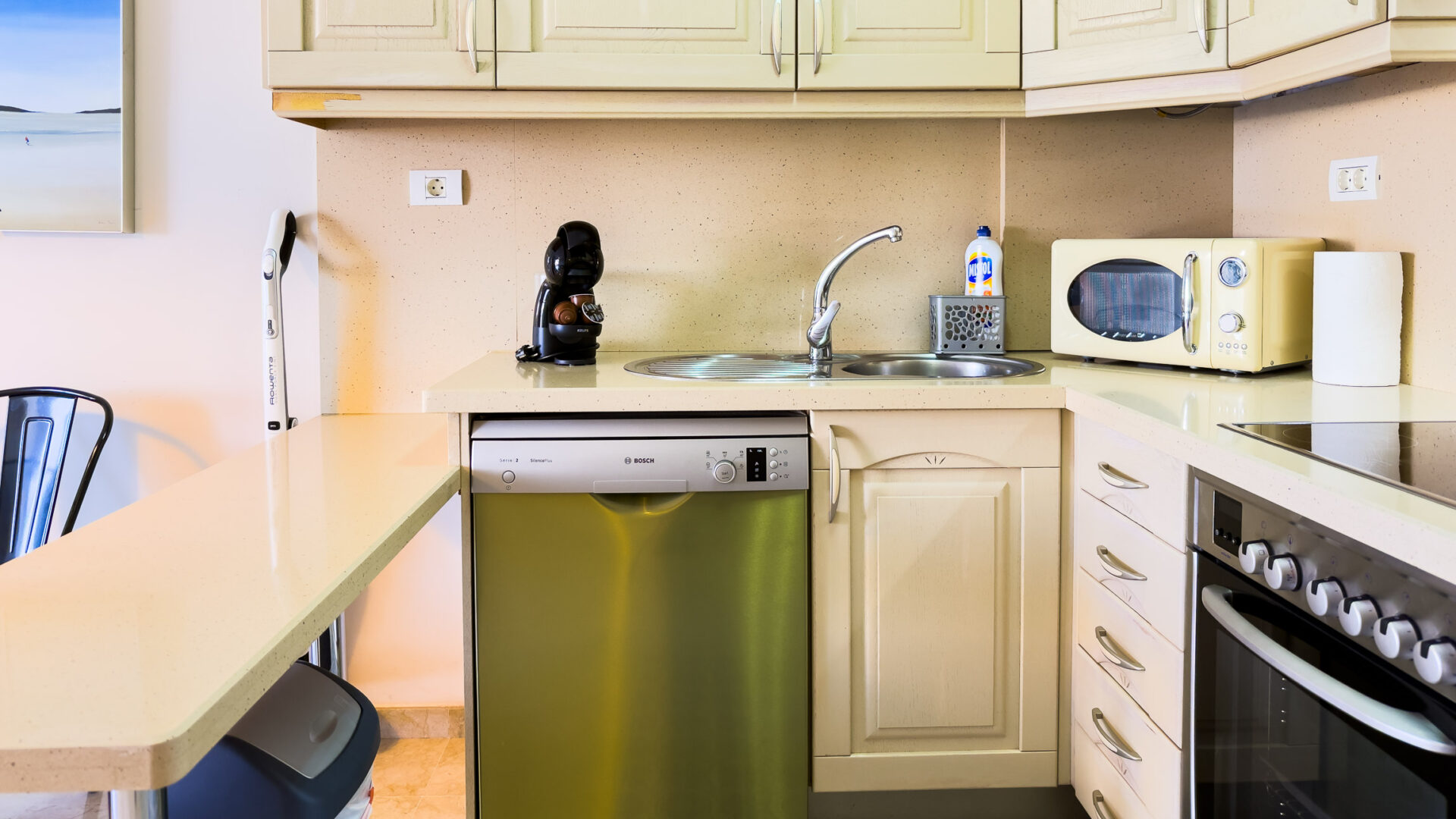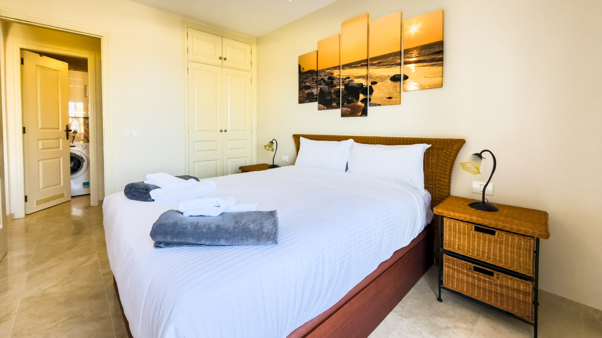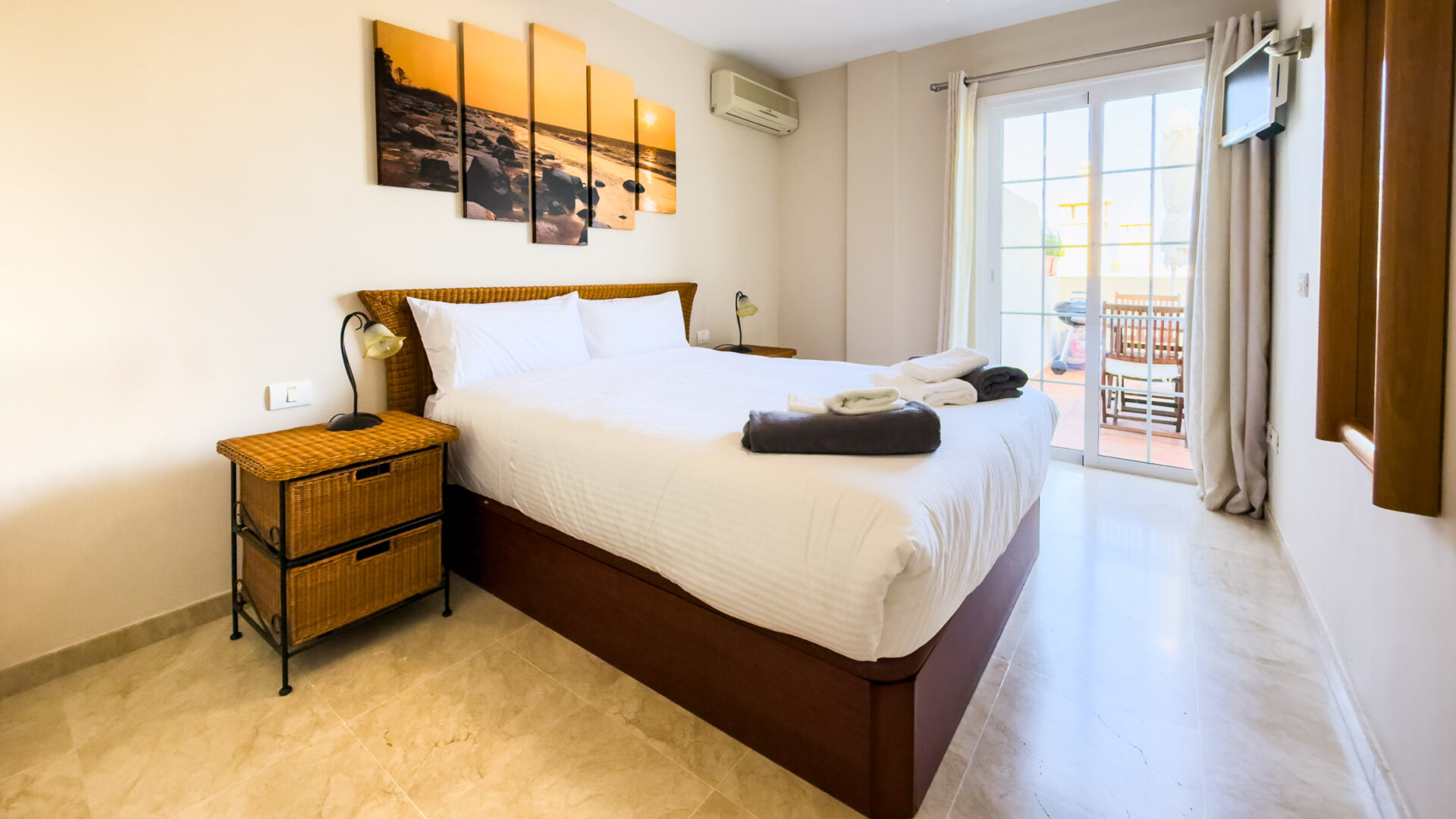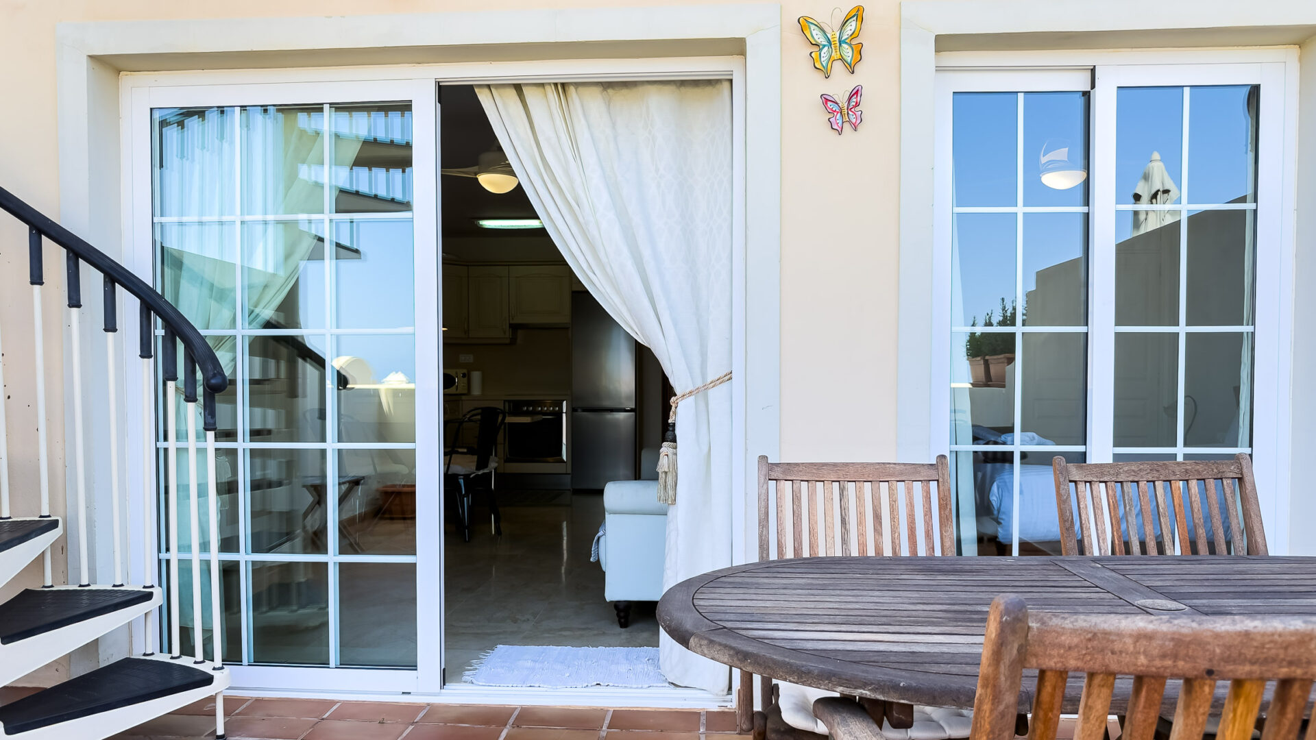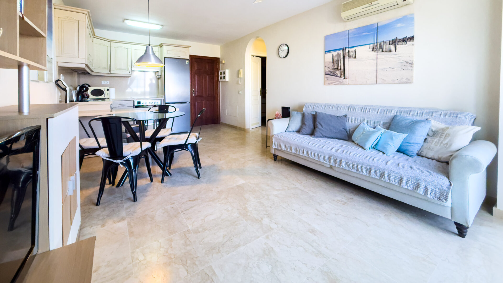 Las Mariposas boasts a well-appointed bedroom with a double bed, TV, built-in wardrobes, and air conditioning. The inviting living room features a sofa bed, flat-screen TV, and dining area adjacent to a fully equipped American-style kitchen, complete with essential appliances like a fridge-freezer, oven, microwave, dishwasher, coffee machine, Nespresso machine, kettle, and toaster.