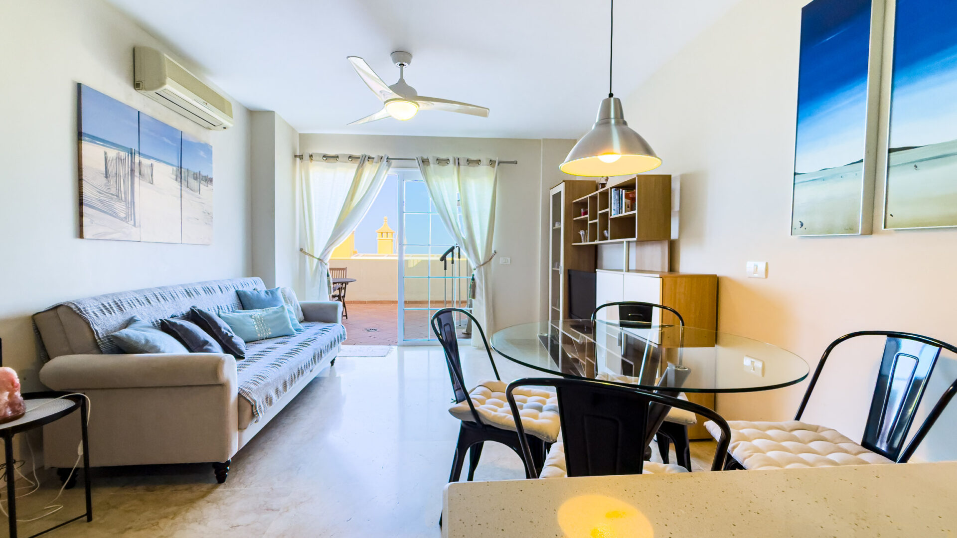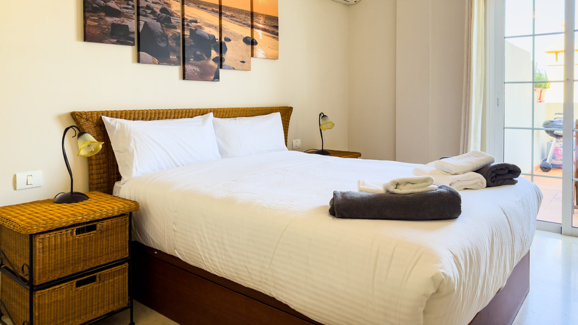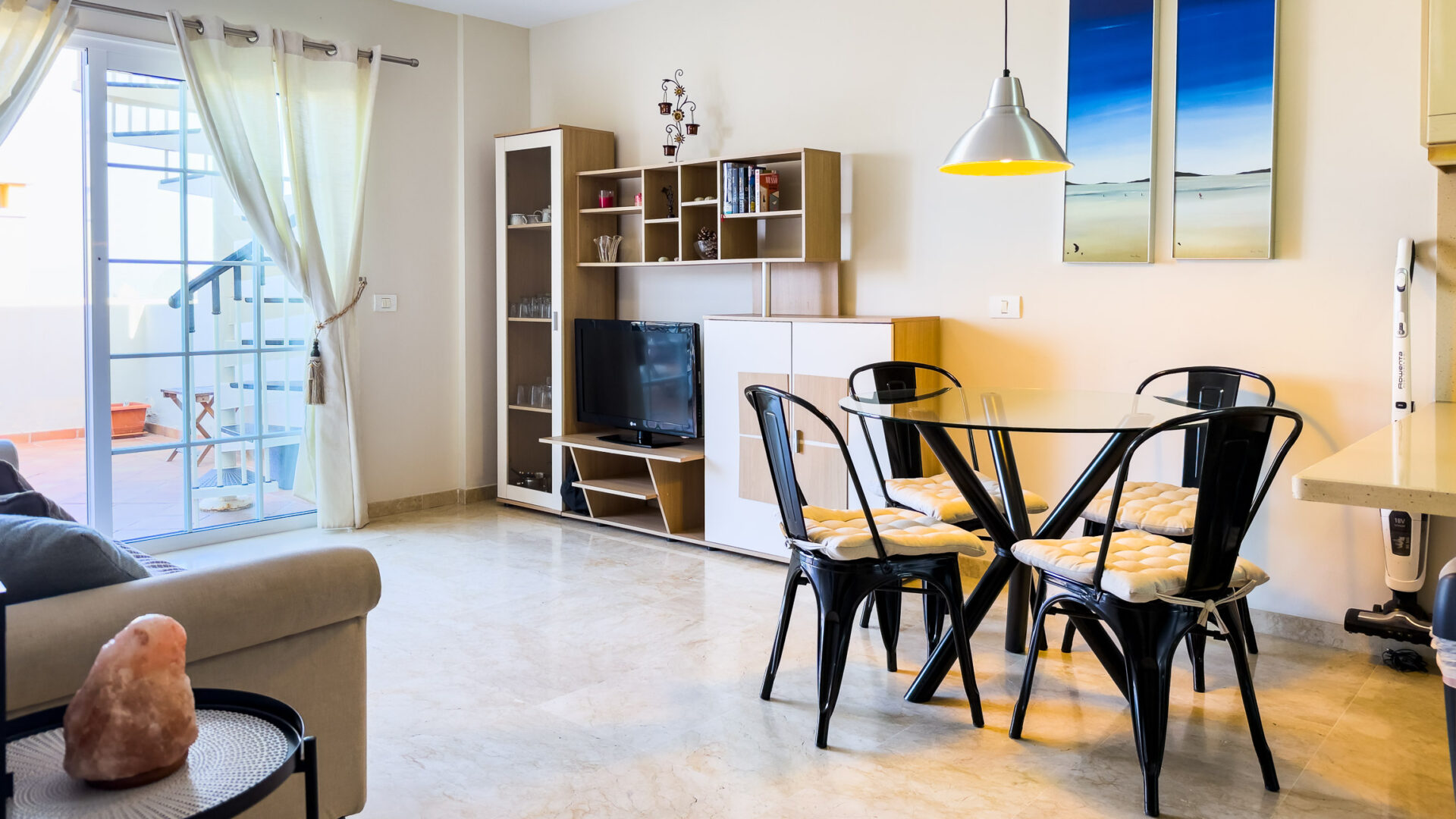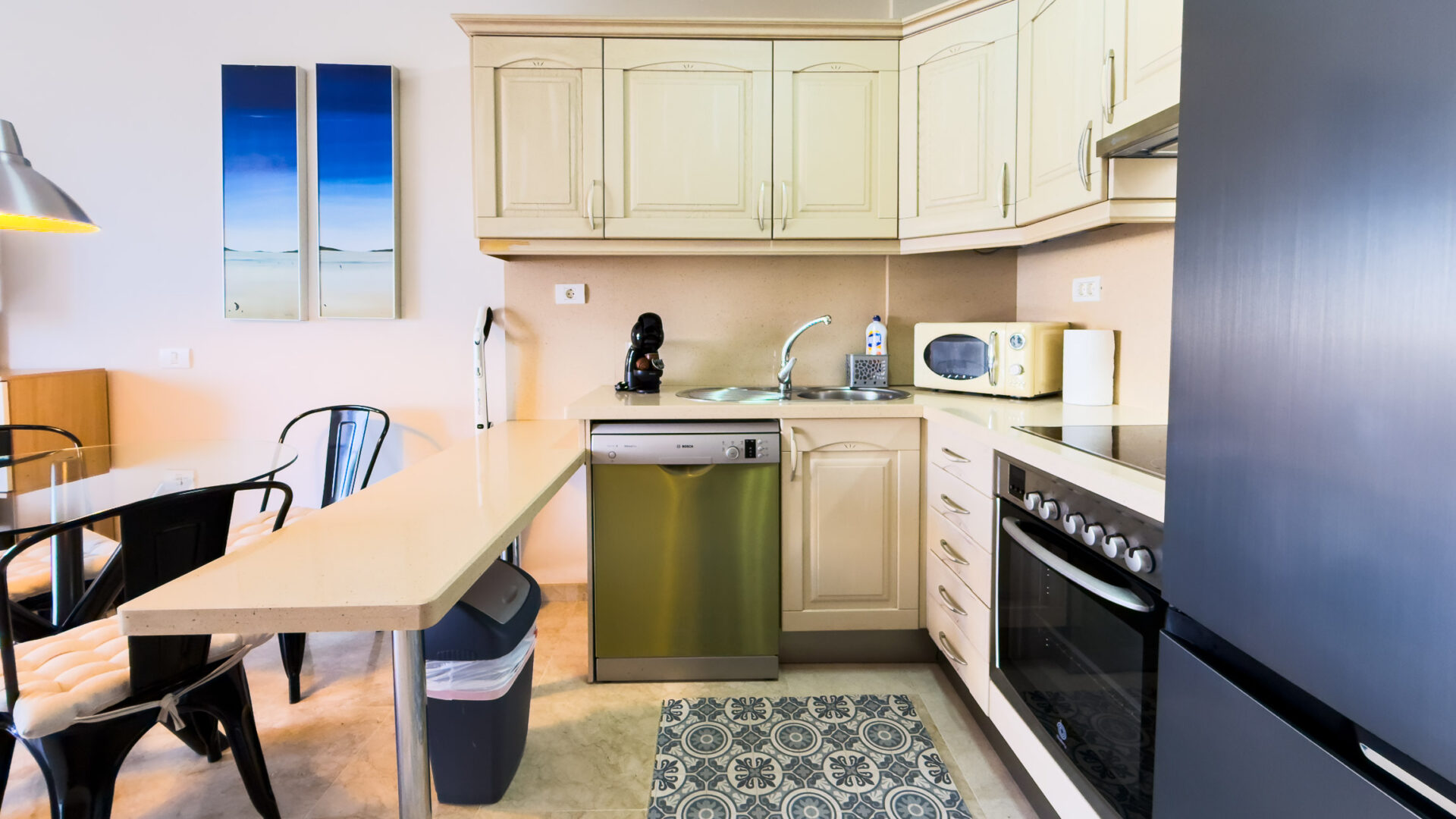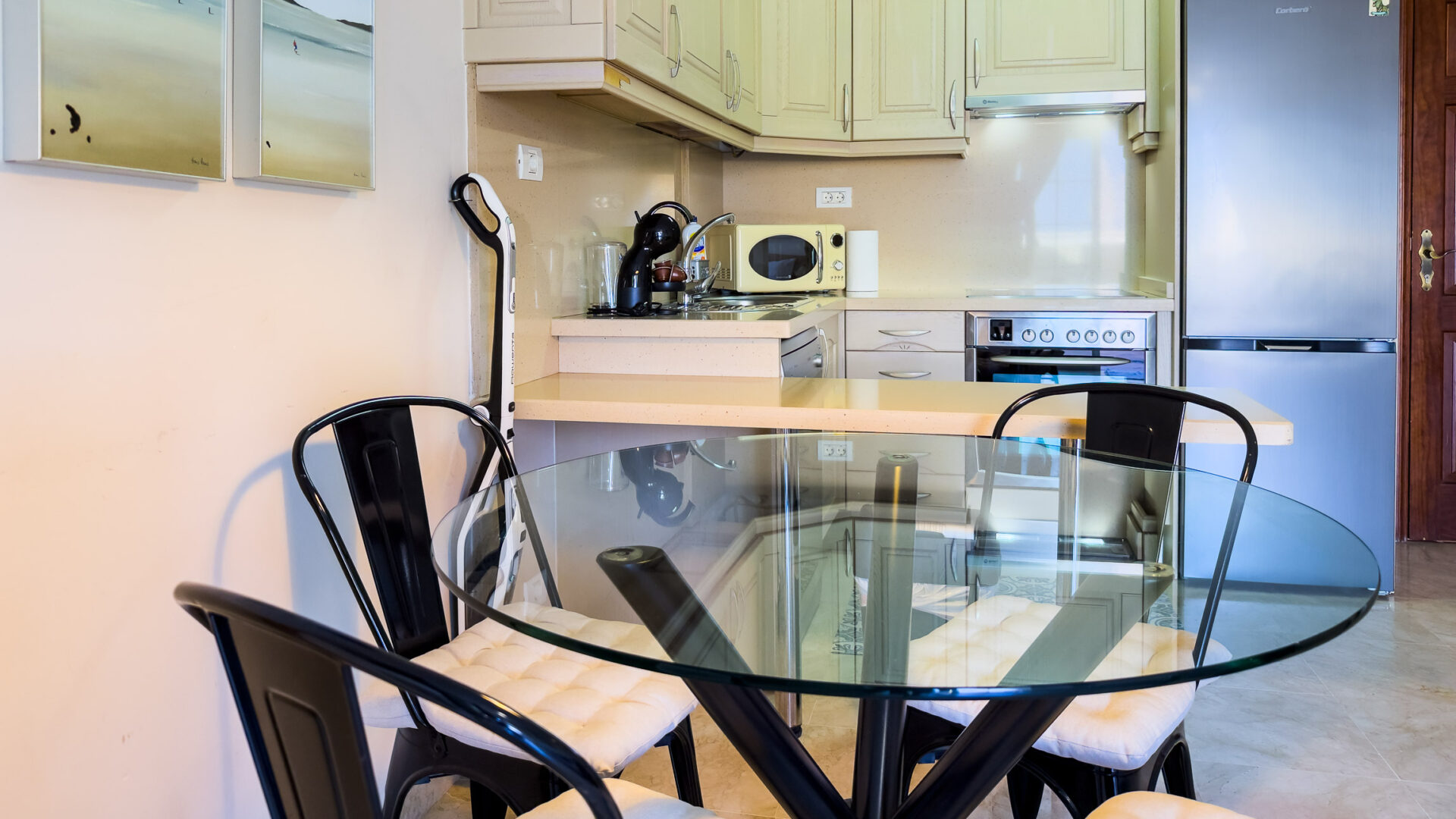 Las Mariposas boasts a well-appointed bedroom with a double bed, TV, built-in wardrobes, and air conditioning. The inviting living room features a sofa bed, flat-screen TV, and dining area adjacent to a fully equipped American-style kitchen, complete with essential appliances like a fridge-freezer, oven, microwave, dishwasher, coffee machine, Nespresso machine, kettle, and toaster.