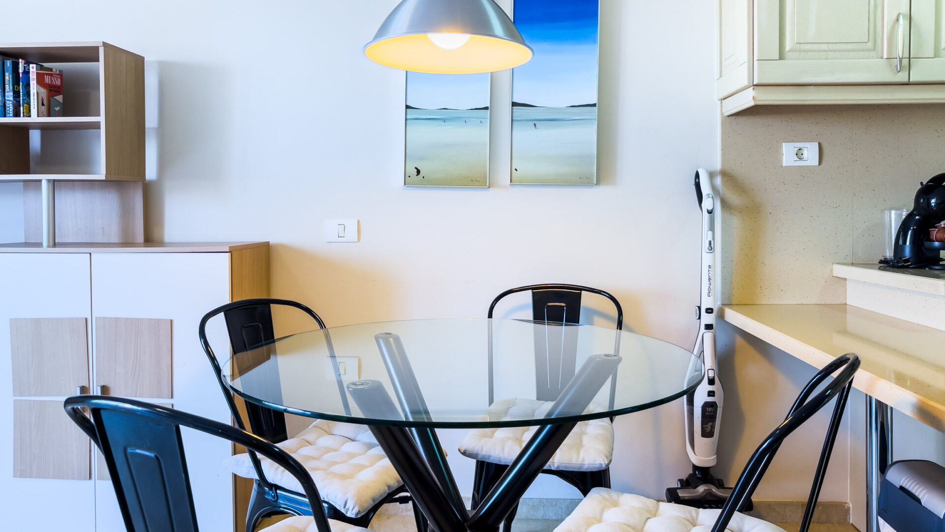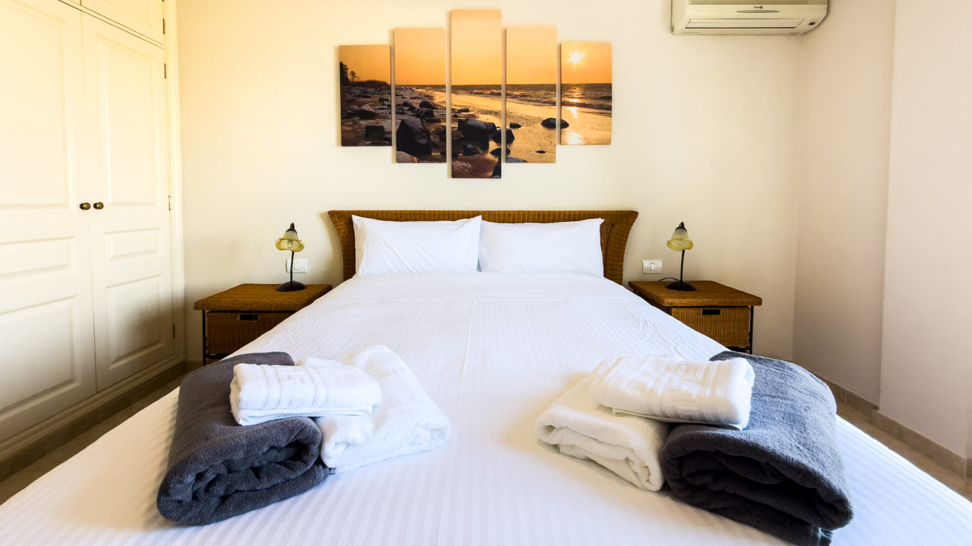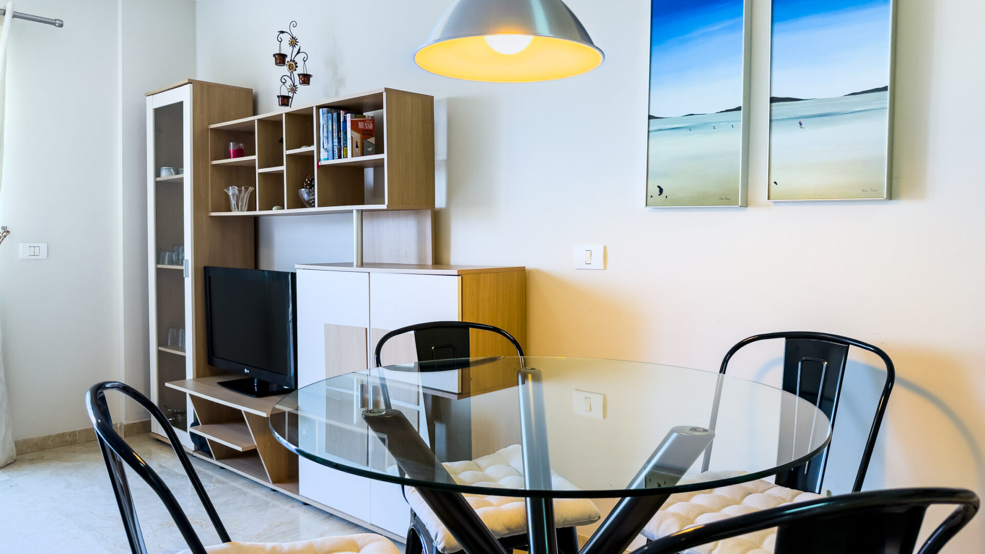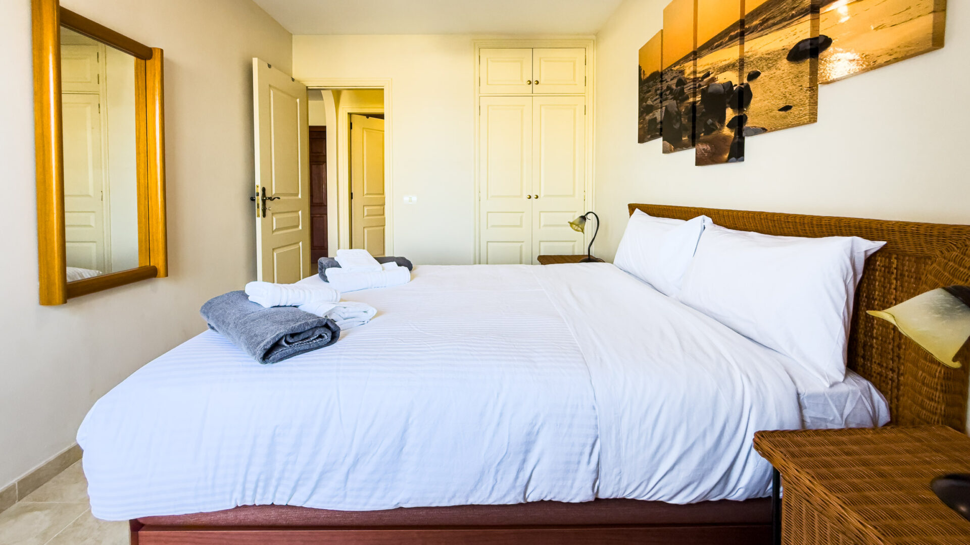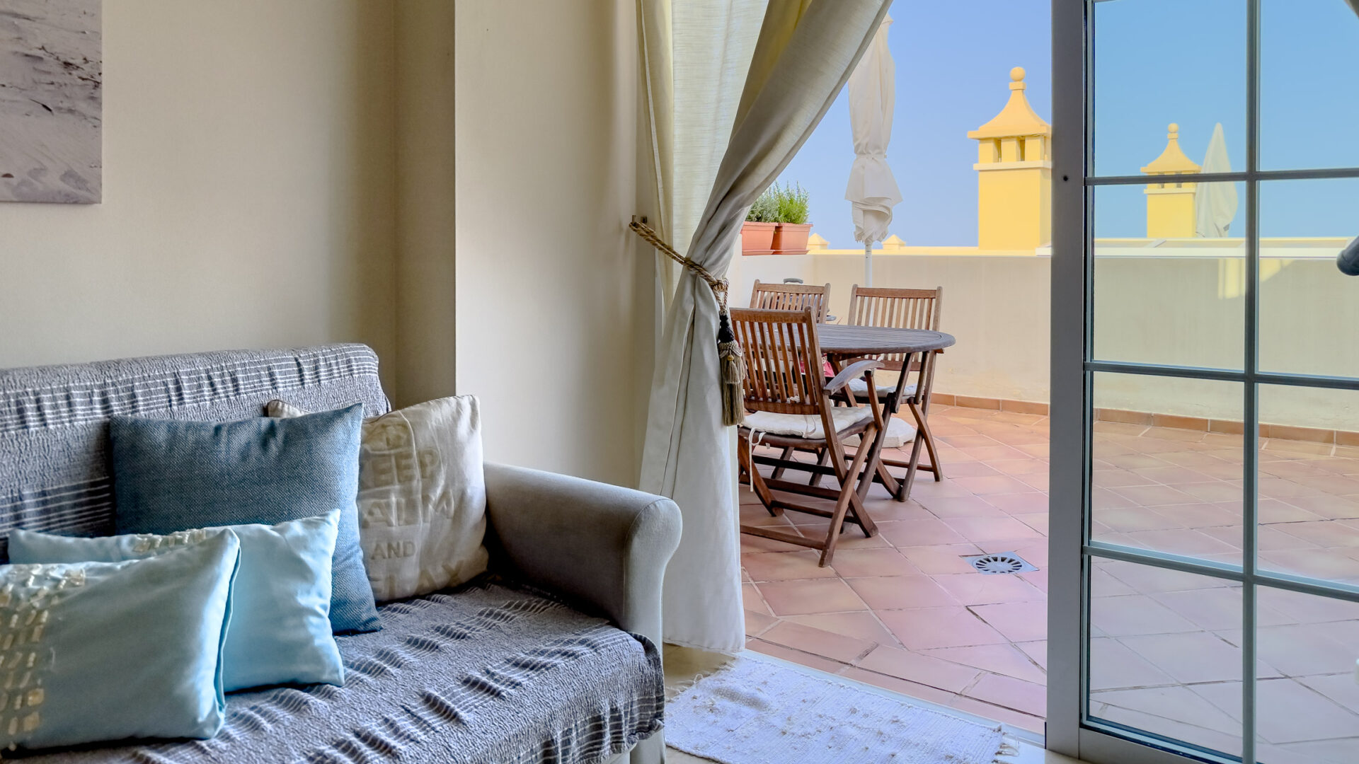 Las Mariposas boasts a well-appointed bedroom with a double bed, TV, built-in wardrobes, and air conditioning. The inviting living room features a sofa bed, flat-screen TV, and dining area adjacent to a fully equipped American-style kitchen, complete with essential appliances like a fridge-freezer, oven, microwave, dishwasher, coffee machine, Nespresso machine, kettle, and toaster.