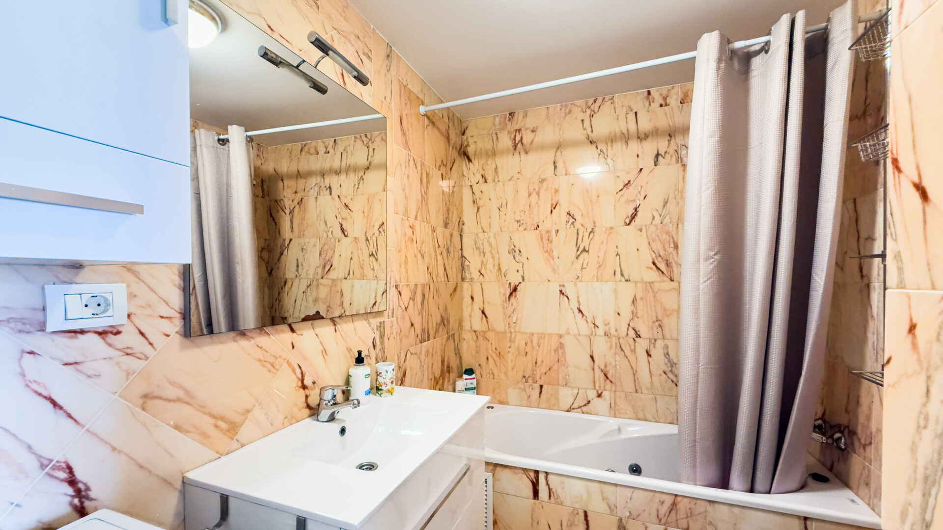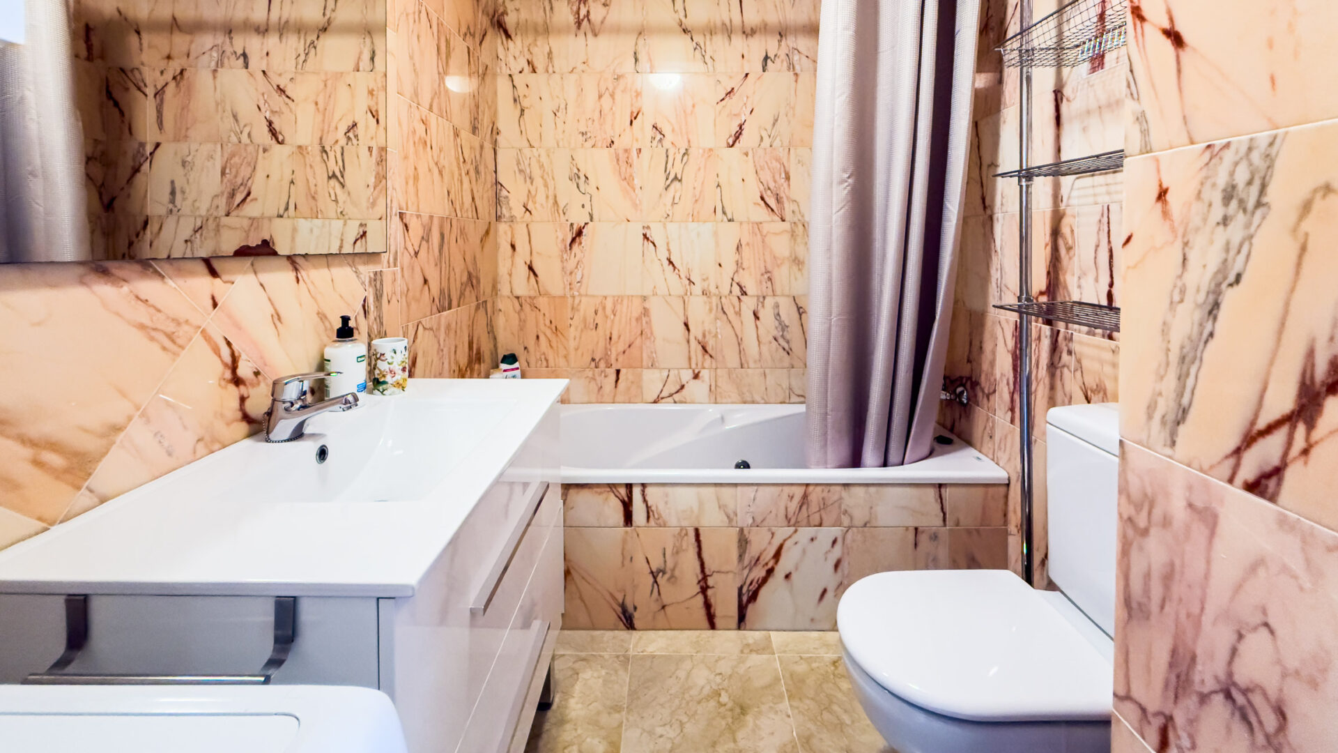 The bathroom offers a relaxing experience with a Whirlpool bath tub with shower, toilet, washing basin, and a washing machine. Complimentary amenities include Wi-Fi and free parking in a communal garage.