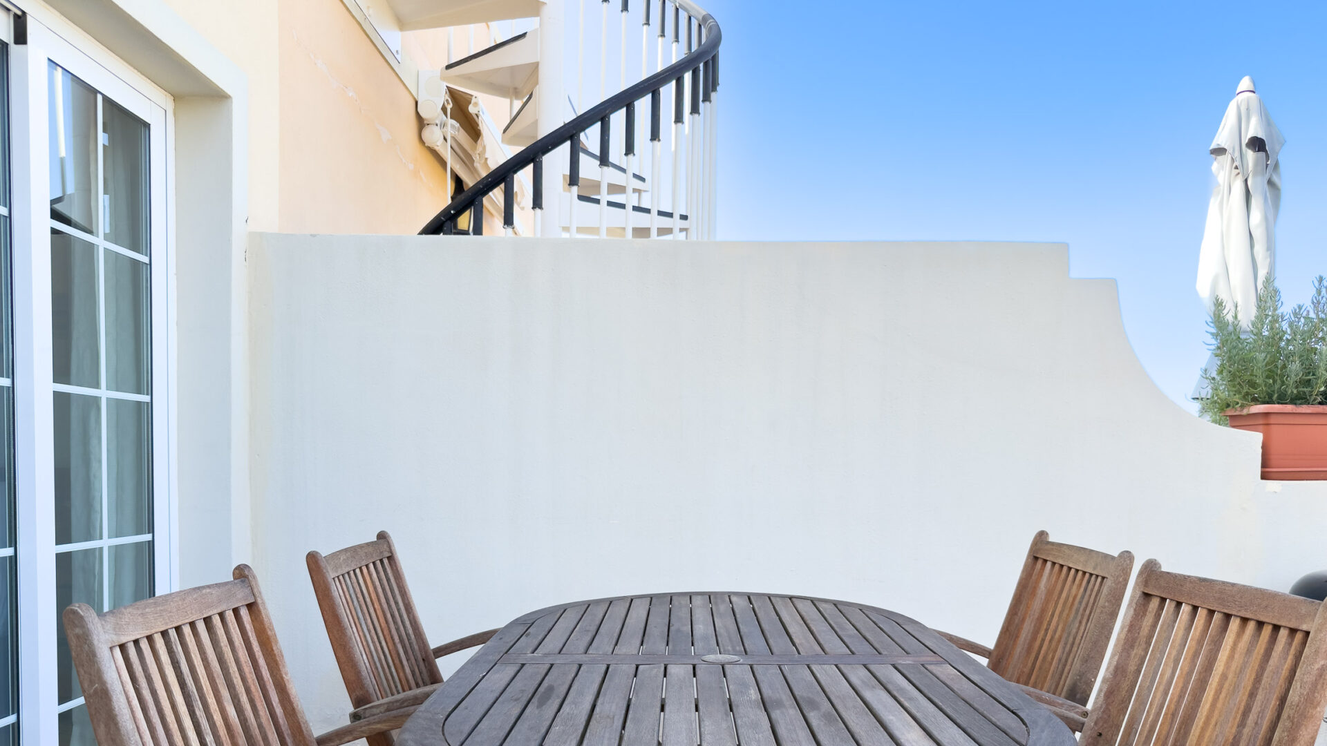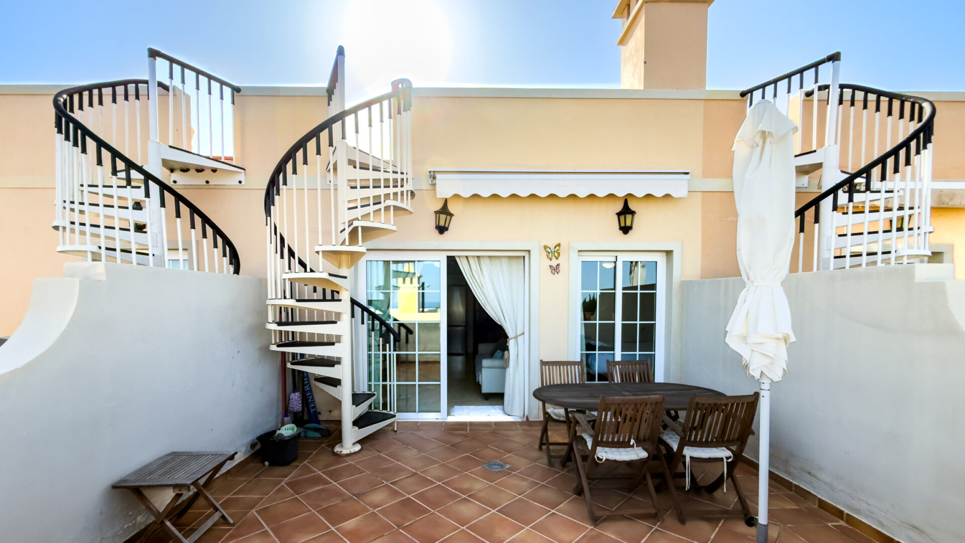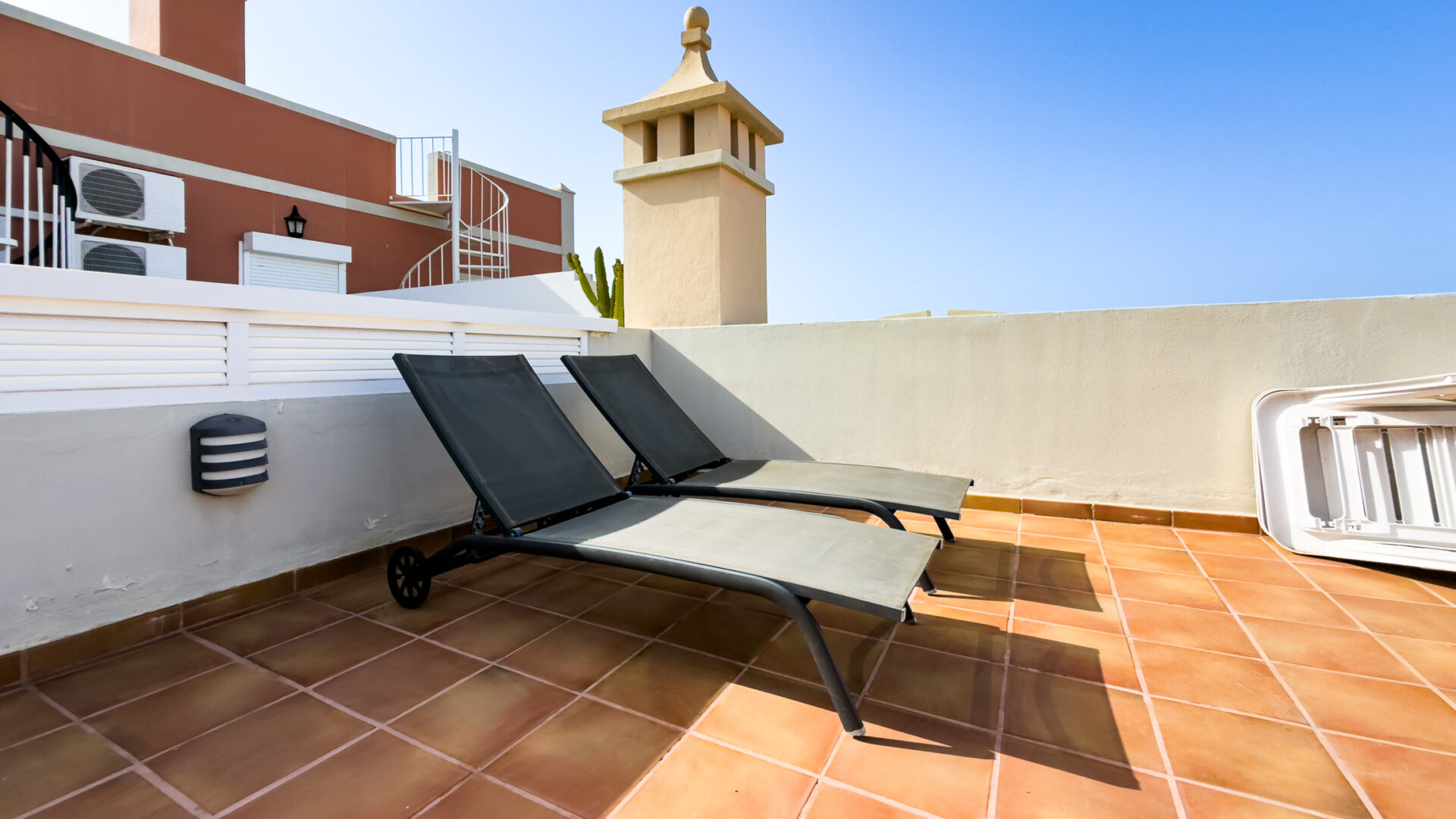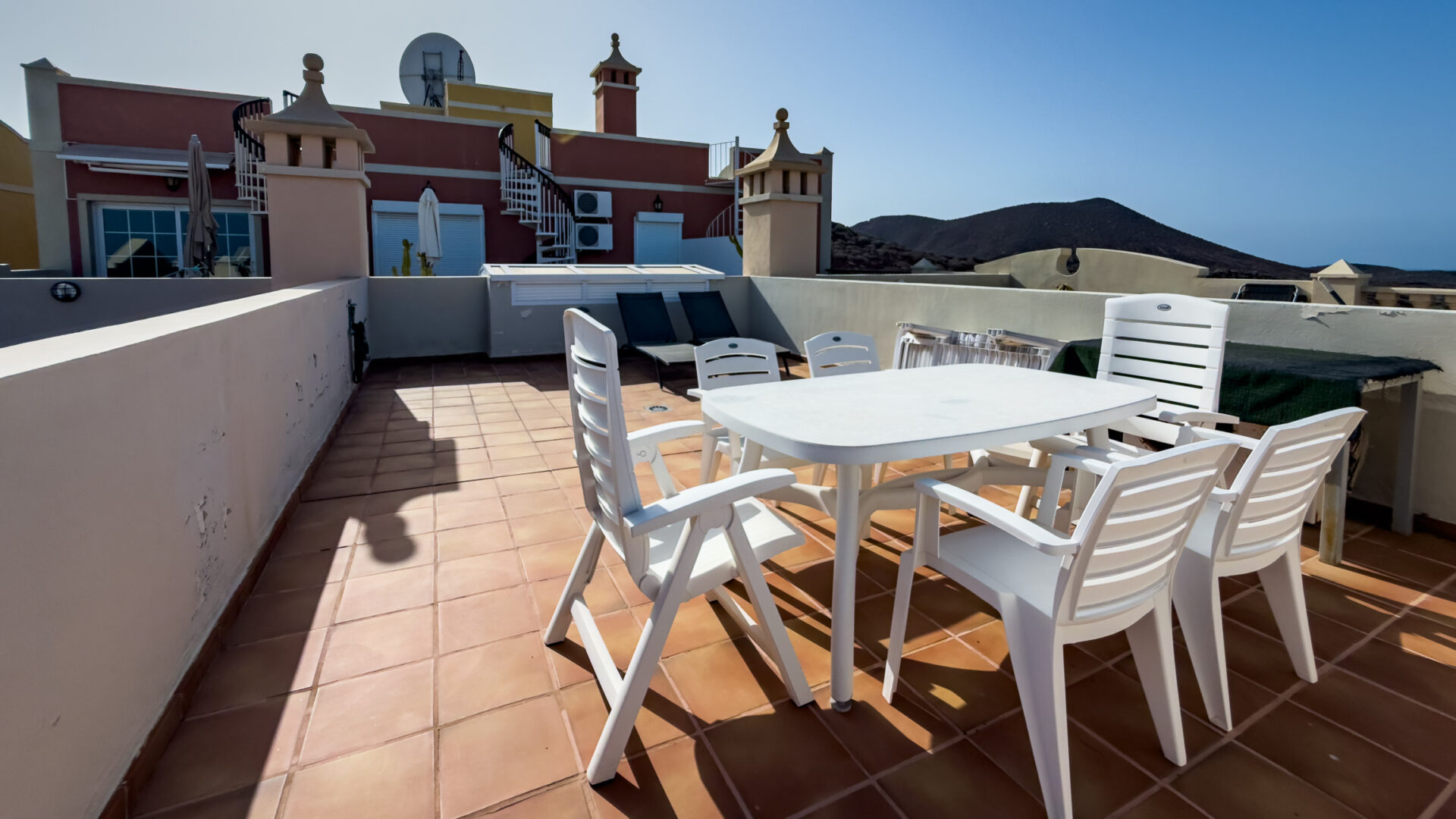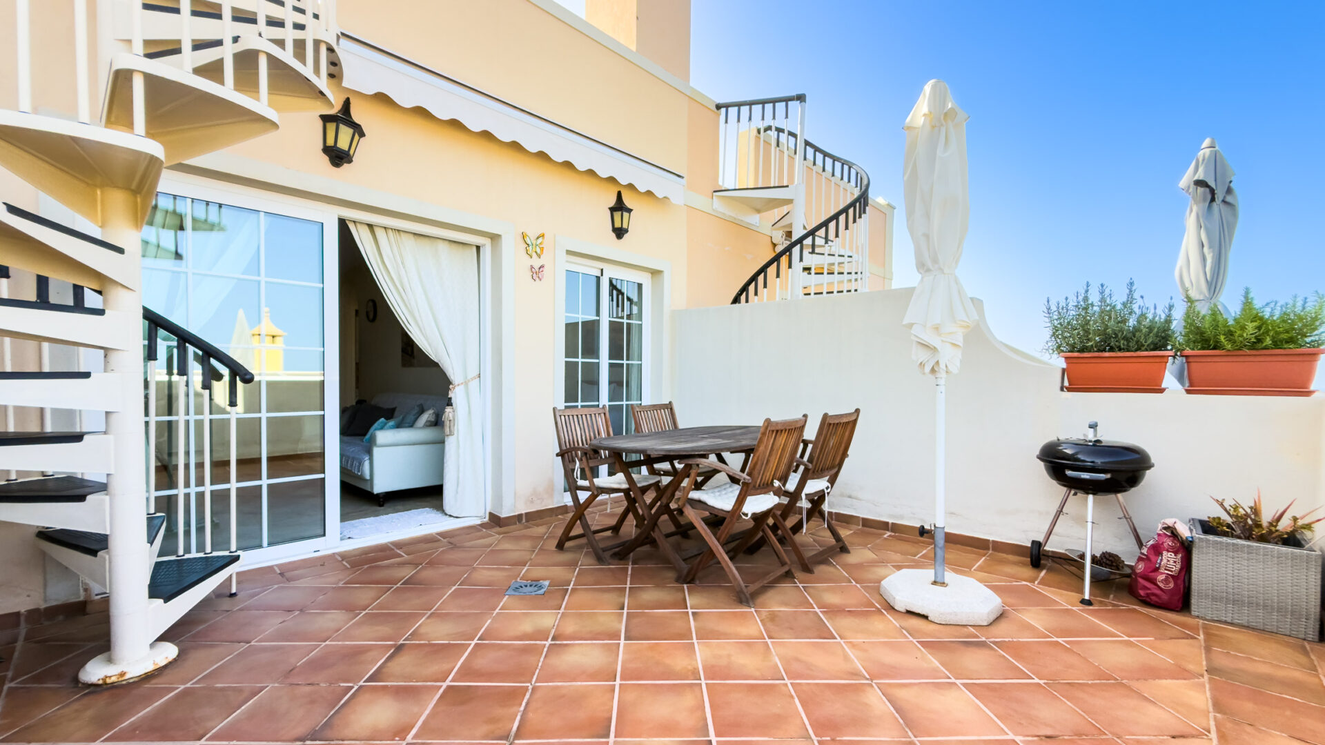 Step outside to unwind on the spacious terrace, equipped with a dining table, chairs, and a charcoal barbecue, perfect for alfresco dining. Additionally, indulge in breathtaking vistas from the expansive roof terrace, furnished with a large table, chairs, and two sun beds.