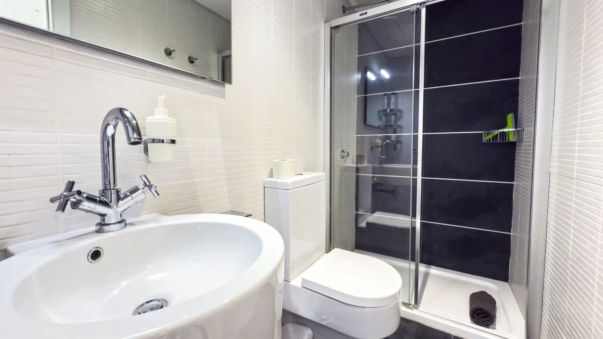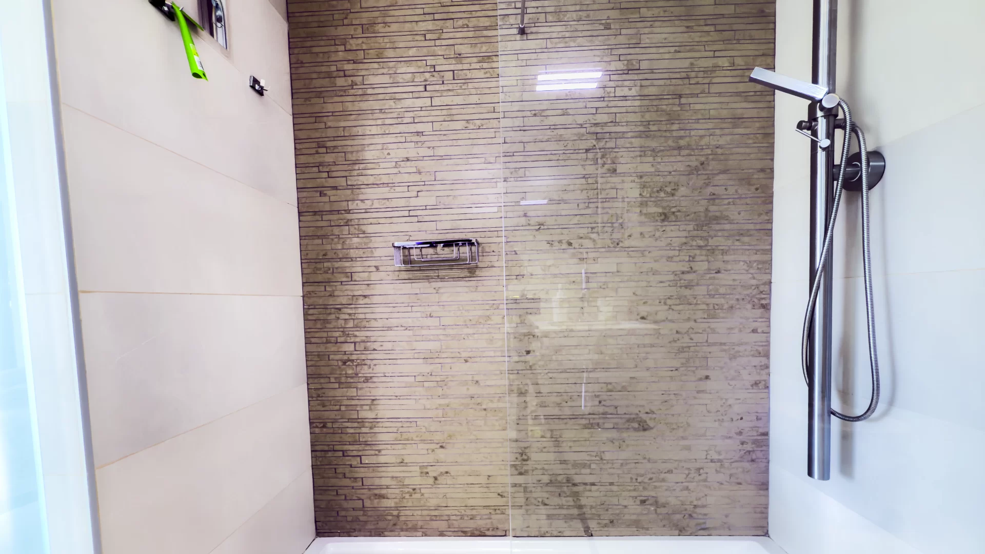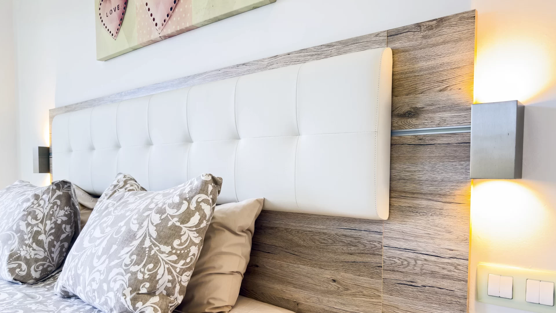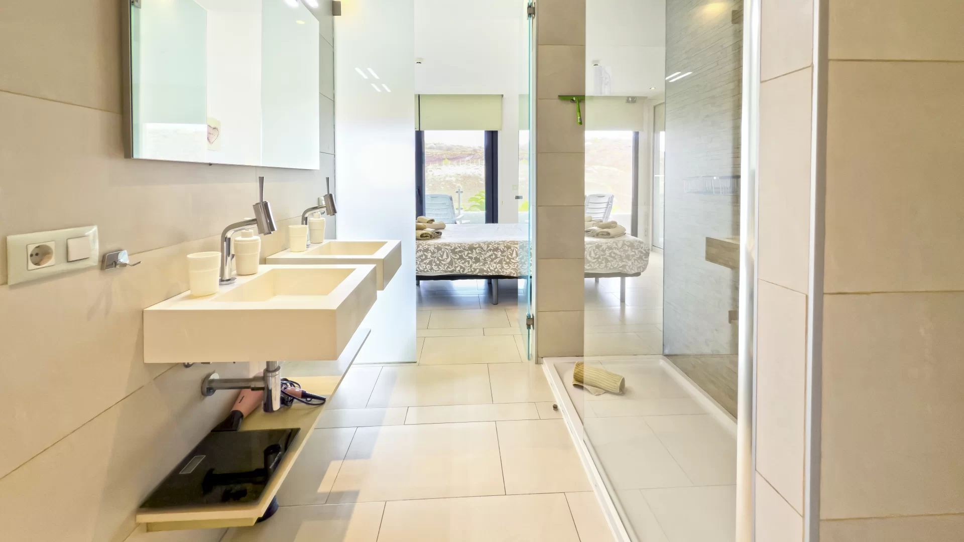 The master bedroom with a double bed is spacious and offers plenty of storage space in built-in wardrobes. In addition, there is a stylishly furnished private bathroom with a shower.