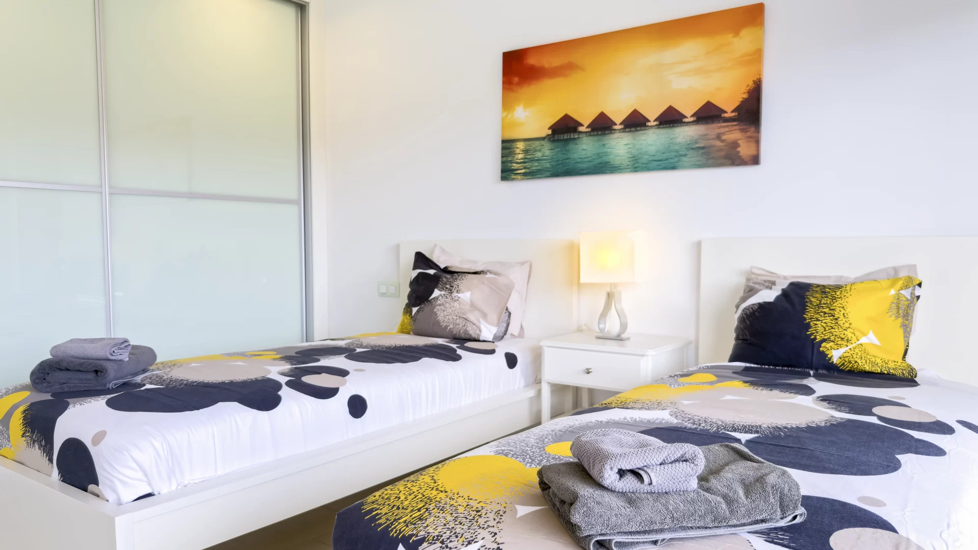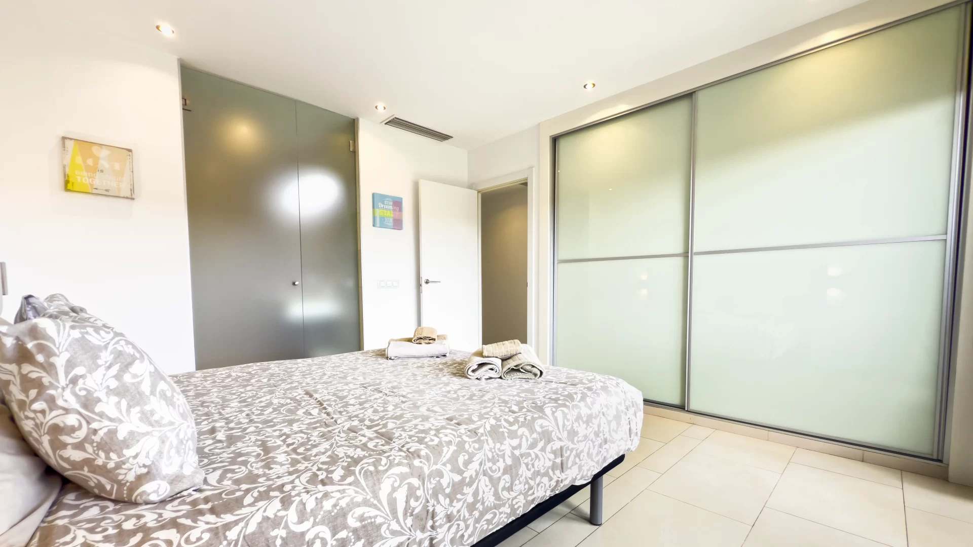 In the second room you will find two individual beds and spacious built-in wardrobes. There is a smaller bathroom in the hallway with a shower. Both bedrooms have large windows with access to a sunny terrace with sun loungers.