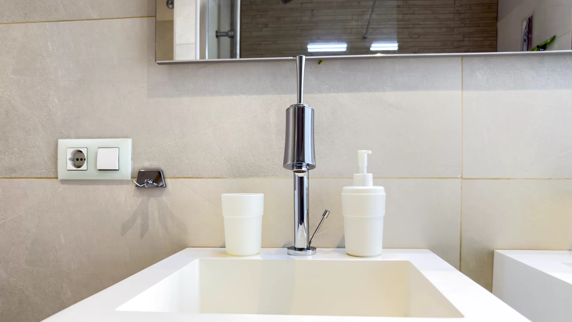 The spacious living room, located on the inside of the complex, overlooking the pool, offers a comfortable leather sofa, a TV with international channels and high-speed WiFi. There is also a dining table with chairs.
